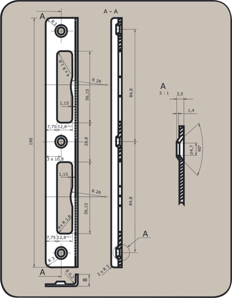 Plech zapadací úhlový 90/72 UNIVERZÁLNÍ, rozteč 85mm, délka 190mm, šířka 20 x 10mm, povrchová úprava bílý zinek