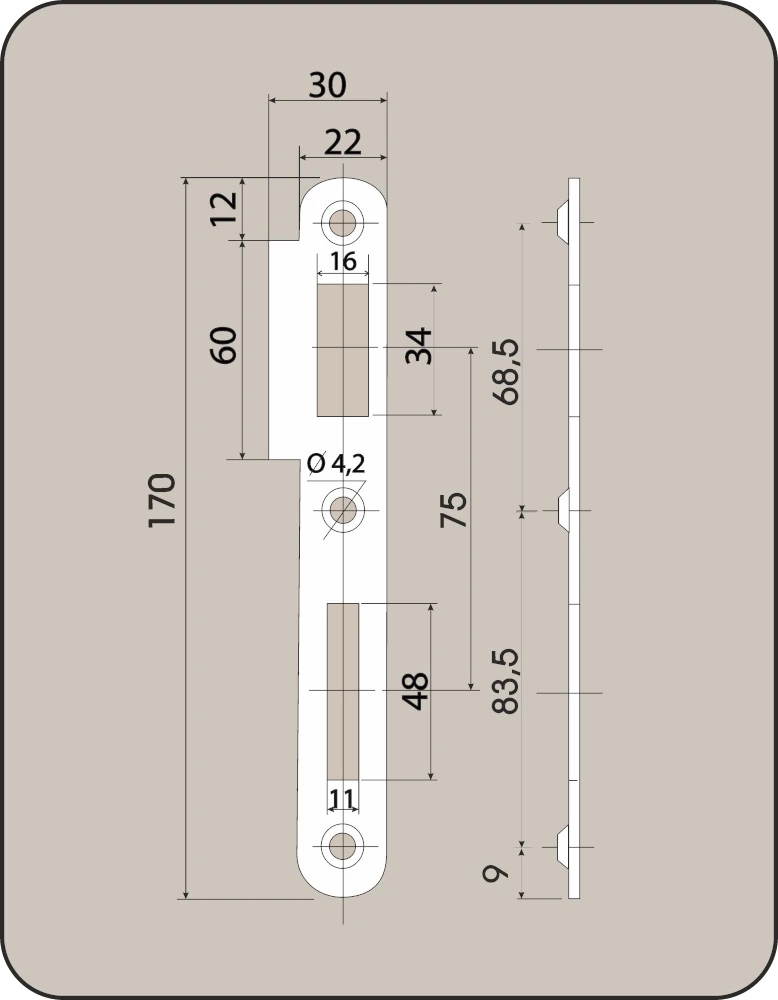Plech zapadací rovný 72 PRAVÝ, rozteč 75mm, délka 170mm, šířka 30mm, povrchová úprava bílý zinek