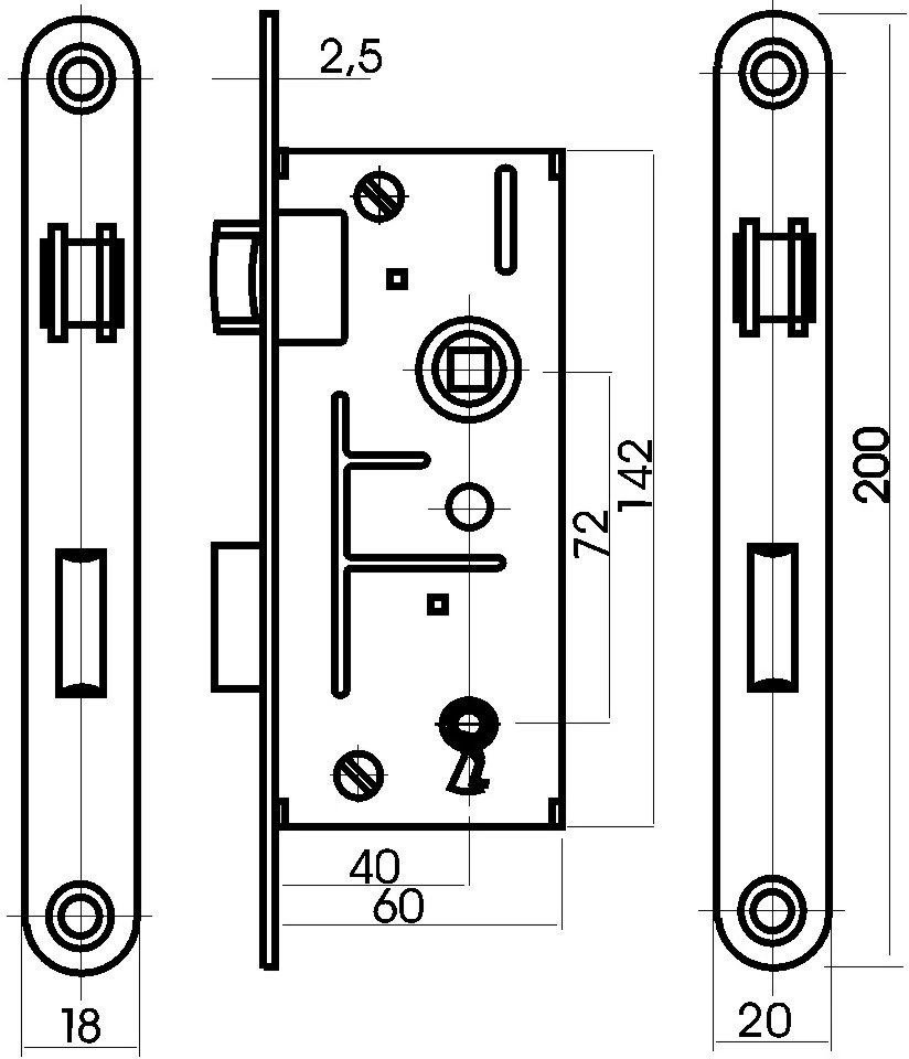 Zámek TESLA K6072 klasický, rozteč 72mm, hloubka zádlabu 60mm, šířka čela 20mm, backset ( hloubka klíče,kliky od čela ) 40mm, zámky je možné měnit pravý / levý, povrchová úprava bílý zinek, nejsou určené pro požární/kouřové dveře k únikovým východům