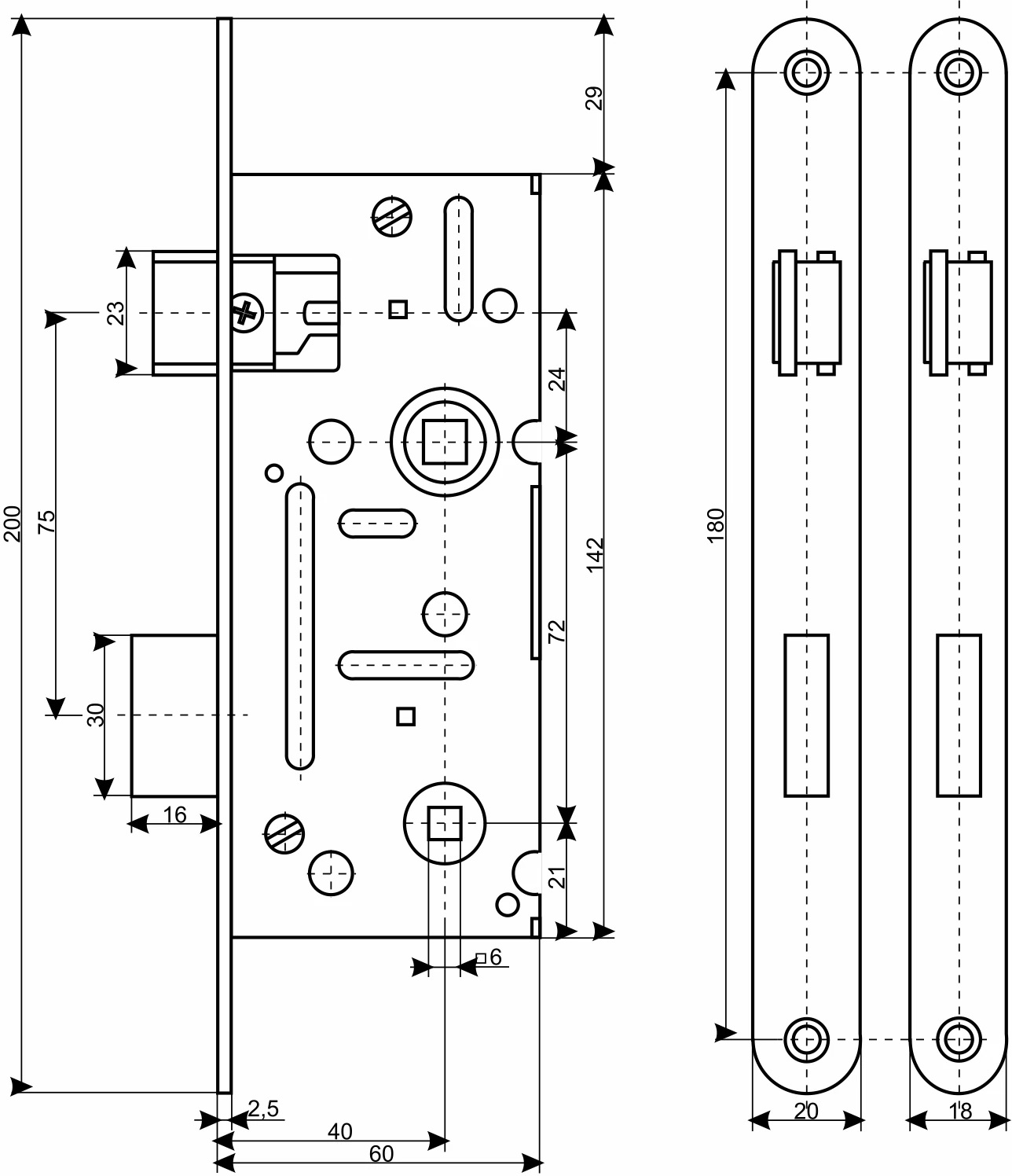 Zámek TESLA WC6072 ořech 6x6, rozteč 72mm, hloubka zádlabu 60mm, šířka čela 20mm, backset ( hloubka klíče,kliky od čela ) 40mm, zámky je možné měnit pravý / levý, povrchová úprava bílý zinek, nejsou určené pro požární/kouřové dveře k únikovým východům