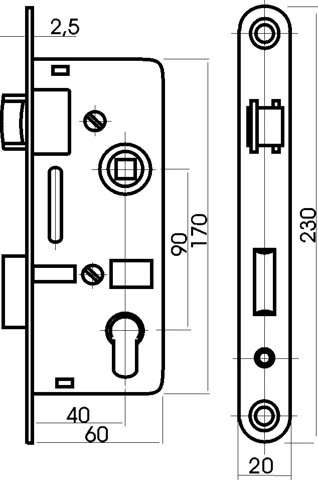 Zámek TESLA V6090/40 vložkový, rozteč 90mm, hloubka zádlabu 60mm, šířka čela 20mm, backset ( hloubka klíče,kliky od čela ) 40mm, zámky je možné měnit pravý / levý, povrchová úprava bílý zinek, nejsou určené pro požární/kouřové dveře k únikovým východům