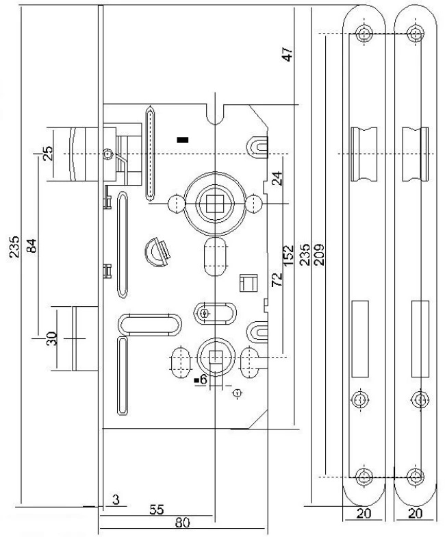 Zámek TESLA WC8072/55 ořech 6x6 PRAVÝ, rozteč 72mm, hloubka zádlabu 80mm, šířka čela 20mm, backset ( hloubka klíče,kliky od čela ) 55mm, povrchová úprava bílý zinek, nejsou určené pro požární/kouřové dveře k únikovým východům